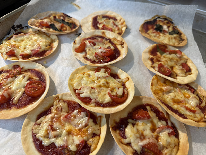 2月のある日、満三歳児ぴんく組は粘土でピザを作っていました。翌日、本物のピザを作って、あか組の子どもにごちそうしてくれました。とても美味しかったです。