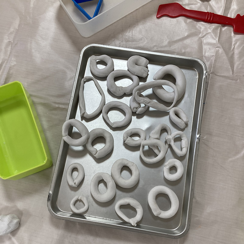 日程を調整し、「あと6回寝たらドーナツ作り」と伝えると、みんな大喜び。ドーナツ作りの日に向けて、カウントダウンが始まりました。そして、現在ドーナツ屋さんで働いている“ベテル幼稚園の卒園生”がお手伝いに来てくれることになりました。「ドーナツ作りの名人」が来てくれることを知った子どもたちは、さらに期待が膨らみます。おうちでも話したようで、はりきって前日からエプロンを持ってきてくれました。材料や作り方を聞き、粘土でドーナツの形を作る練習をして、もう準備はバッチリです。いよいよ、本番当日です。