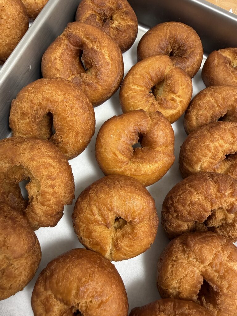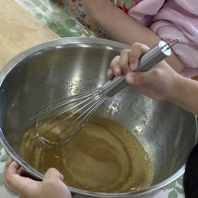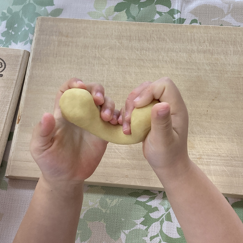 「ドーナツ作りの名人」の卒園生を迎え、身支度を整えて、少し緊張した様子でドーナツを作ります。卵や牛乳、小麦粉などの材料を順番に混ぜていきます。材料を入れて、混ぜるたびに変わる生地の色や感触、においを感じながら、生地を混ぜていきます。名人の混ぜ方はスピードが速くて、子どもたちから「わぁ~!」と歓声があがりました。少し休ませた生地を名人がしっかりこねます。力のいる作業、子どもたちも応援します。小さくちぎった生地を自分でドーナツの形にしてきます。「できたよ」「こんな形でいい?」とできたドーナツを見せながら、たくさん作りました。子どもたちの作業はここまで。あとは名人に揚げてもらいました。